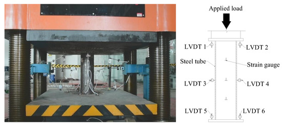 The load was applied by a 30,000 kN computer controlled electro-hydraulic servo universal testing machine in this research as shown in Figure 2. Four linearly varying displacement transducers (LVDTs) were installed at the bottom platen and upper platen of testing machine to detect the axial displacement respectively. The representative axial displacement was acquired from the mean value of the four readings. Two LVDTs were fixed at the middle of the testing specimens to test the hoop displacement. Twelve strain gauges were arranged on the front and back sides of steel tubes to test the lateral and axial strains at 1/4 height, 1/2 height and 3/4 height of steel tube column. All LVDTs and strain gauges were connected to a DH3820 data acquisition system for recording the data. The load was recorded by the testing machine. Loading control mode at a constant rate of 20 kN/min was used to apply load for all specimens. For all specimens, the test was terminated when the axial displacement attained 60 mm.