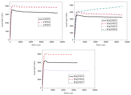 - Plastic stage: After ultimate load, the specimens fell in plastic stage. At this stage, the axial load remained roughly unchanged or a slight decrease with strain increased for most of the specimens. Only the axial load of PACFST4 stub columns increased with strain which might be mainly due to the larger confinement index. All PACFST stub columns exhibited favorable ductility after ultimate load which were in keeping with that of CFST stub columns.