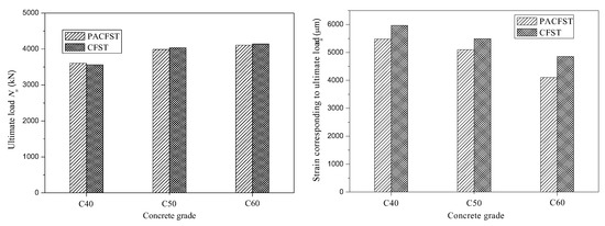 Figure 5 presented the variation of ultimate load and strain at ultimate load with concrete type and concrete strength. It could be seen the ultimate load of PACFST stub columns and CFST stub columns were almost the same when the compressive strength of PAC and NC were similar. The ultimate bearing capacity of PACFST stub columns enhanced with increase of concrete strength which were consistent with the variation of CFST stub columns. The strains of PACFST stub columns at ultimate load were a bit less than that of CFST stub columns. It might be mainly due to the higher elastic modulus of PAC compared with that of NC. Compared with CFST stub columns, at the similar ultimate load, the decrease in strains at ultimate load were 8.15% for C40, 7.14% for C50 and 15.48% for C60. Thus, at the same bearing capacity, replacing NC by PAC to prepare CFST column was benefit to reduce the deformation of CFST column under axial load.
