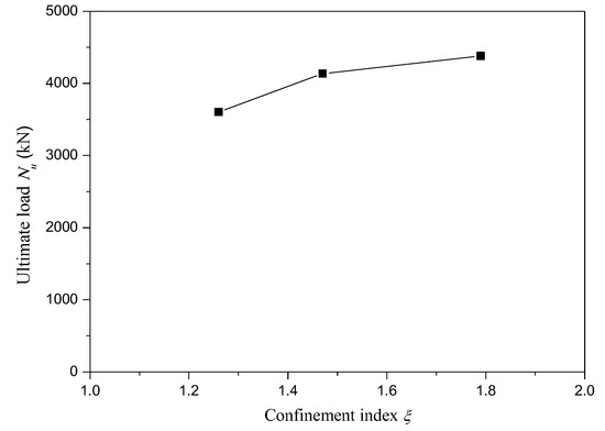 Under the same PAC strength grade, steel strength and external diameter of steel tube, the ultimate load Nu of PACFST stub columns varied with confinement index ξ were illustrated in Figure 7. It could be discovered that the ultimate load Nu of PACFST stub columns increased with increase of confinement index ξ which were in accordance with the CFST stub columns. Increasing of confinement index ξ from 1.26 to 1.47 and 1.79 resulted in a rise of the ultimate load Nu of PACFST stub columns from 3605 kN to 4136 kN and 4379 kN respectively. Apparently, about 14.8% and 21.5% increment of ultimate load Nu of PACFST stub columns would be occurred as confinement index ξ increased from 1.26 to 1.47 and from 1.26 to 1.79. This might be mainly attributed to the fact that the higher the confinement index ξ, the greater the confinement effect of PACFST stub columns would be. Increasing the confinement effect of PACFST stub columns was benefit to enhance the bearing capacity of PACFST stub columns which was in consonance with CFST stub columns.