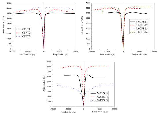 Axial load-axial strain and axial load-hoop strain curves for all specimens.
