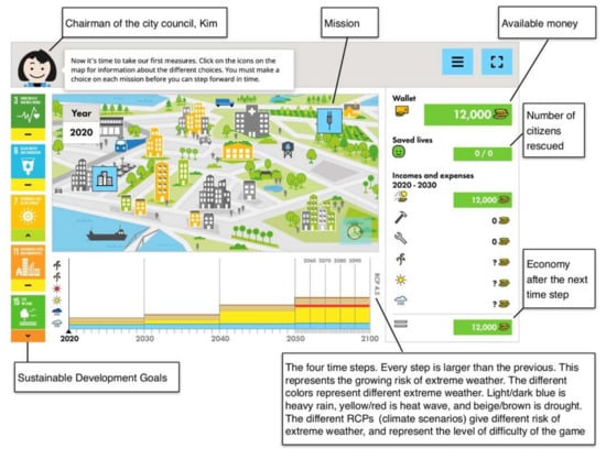 Apart from adapting the city to climate change (defined by how many lives and ‘coins’ that are saved due to successful adaptation), the player also needs to keep the city’s economy in shape, and simultaneously reach five selected global sustainable development goals. Included goals are health, water and sanitation, sustainable built environment, energy and biodiversity [47]. In order to obtain a high final score, the player must take into account how decisions in the virtual city affect these goals.