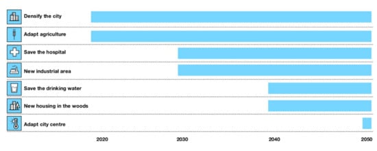 The player, who acts as the climate adaptation coordinator in Weatherton, a fictional city, encounters seven different climate related missions. These missions are successively introduced during a number of time steps as shown in Figure 2. Two missions are introduced in the beginning of the game (year 2020): (1) densify the city; and (2) adapt agriculture. After the first 10-year time step (to the year 2030) two new missions are introduced (3) build a new industrial area; and (4) save the hospital from flooding. The next time step takes the player to year 2040 when the missions (5) save the drinking water; and (6) new housing area in the woods are introduced. After the next time step (to year 2050) the final mission—(7) adapt city center is added. Finally, a 50-year time step takes the players to year 2100. The missions, once available, are accessible in each successive time step until the year 2050, and can subsequently be upgraded.