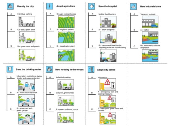 For each challenge, the player chooses between different alternatives, which imply different degrees of climate adaptation with different costs and consequences for the city’s sustainability, or to ‘do nothing’ (Figure 3). In conjunction with each time step, climatic events (the number of heat waves, floods, droughts with two different recurrence intervals) occur that affect the game result. These climate change related events reflect the trend for climate change, depending on the climate scenario (RCP 2.5, 4.5 or 8.5) that the player chooses at the beginning of the gaming session, as well as the natural variability. As such, no gaming session has the same results.