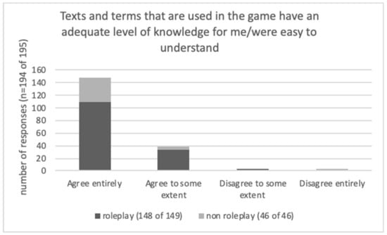 In the survey, participants were asked to what extent the texts and terms that were used in the game had an appropriate knowledge level. A total of 76% of the respondents agreed entirely with this claim (Figure 6).