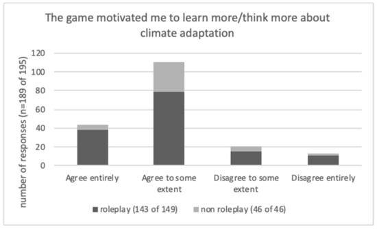 Different outcomes from the methodological approaches of the moderated roleplay and the single-player settings were to some extent indicated from the text responses, however, since the number of surveys from each group was not sufficient to show a statistically significant result, we did not attempt to make a quantitative comparison between these two groups. As a general assessment, the majority of players responded that they to at least some extent considered that the game motivated them to learn more or think more about climate adaptation in the future (82%), which corresponded to the overall purpose of the climate adaptation game (Figure 7).