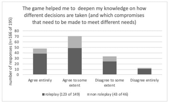 The following question, whether the students agreed that the game helped them to enhance their knowledge on how different decisions are made and which compromises that are required, resulted in a wider distribution of responses, although the majority (72%) responded that they agreed or agreed to some extent (Figure 9).