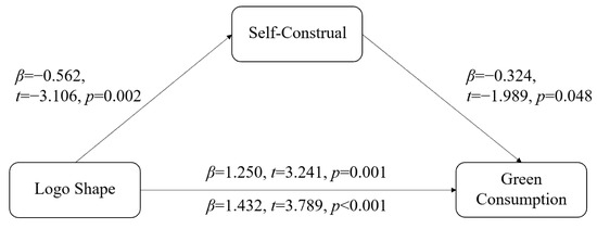 To test whether self-construal mediates the effect of logo shape on green consumption, we conducted a bootstrap analysis with 5000 samples [50,51] using logo shape condition as the independent variable (angular logo = 0; circular logo = 1), self-construal as the mediator, and green consumption as the dependent variable. The 95% Cis did not include zero, indicating that self-construal mediates the effect of logo shape on green consumption (indirect effect = 0.18, SE = 0.11, 95% CI [0.02, 0.45]). Controlling for self-construal, the direct effect of logo shape on green consumption was significant (direct effect = 1.25, SE = 0.39, 95% CI [0.49, 2.01]), suggesting partial mediation. Results of the regression showed that self-construal partially mediated the effect of logo shape on green consumption (see Figure 3), therefore providing support for H2.