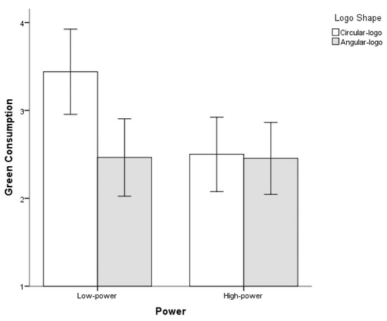 A 2 (power: high vs. low) × 2 (logo shape: circular logo vs. angular logo) between-subjects ANOVA using green consumption as the dependent measure revealed a significant effect of power (F(1, 287) = 4.60, p = 0.033, partial ω2 = 0.016), a significant effect of logo shape (F(1, 287) = 5.31, p = 0.022, partial ω2 = 0.018), and a significant interaction (F(1, 287) = 4.40, p = 0.037, partial ω2 = 0.015). As we expected, a simple effect test revealed that when participants were primed with low sense of power, participants in the circular logo condition reported greater purchase intention for green product (M = 3.44, SD = 2.11, 95% CI [3.01, 3.87]) than did participants in the angular logo condition (M = 2.47, SD = 1.86, 95% CI [2.03, 2.91]), F(1, 287) = 9.74, p = 0.002, partial ω2 = 0.033 (see Figure 6). In contrast, when participants were primed with high sense of power, there was no significant difference between the circular logo condition (M = 2.50, SD = 1.75, 95% CI [2.05, 2.95]) and angular logo condition (M = 2.46, SD = 1.80, 95% CI [2.03, 2.88]) on green consumption (F < 1).