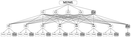 Each of the method’s dimensions has seven variables, which require rating in terms of linguistic variables employing the FSAW method in the same way as the dimensions. After the method’s application, a weight for each variable is attained. It is worth observing in Figure 5 that the method allows alterations in the number of criteria (C.n), dimensions (D.n) and variables (V.n). Modifying those elements enables the method to be employed in other knowledge areas.