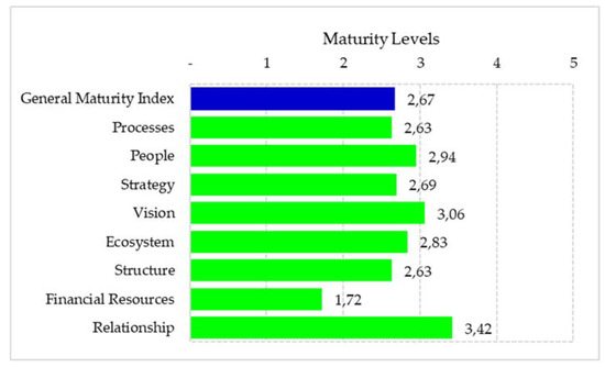 As a part of the proposed method, it is necessary to multiply the GMI and the DMI by five to attain the TT Maturity Level. For the general maturity level, GMI = 0.5748 × 5 = 2.87, and for the dimension maturity level, DMI = 0.7401 × 5 = 3.70, in a scale that goes from 0 to 5 as displayed in Figure 3.