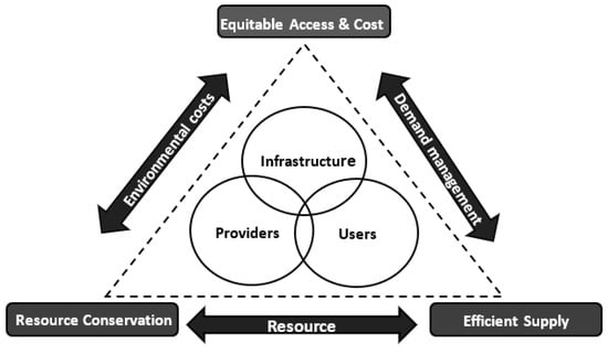 The triangular model of urban water sustainability. From Leigh and Lee [] (p 4).