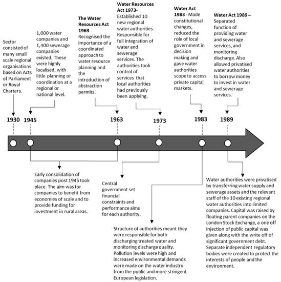Water supply and governance in England and Wales has undergone significant change during recent history. Prior to the 1960s, water supply and sewerage services were mostly covered on a city or town basis through regional municipalities which had developed on an ad hoc basis. This resulted in more than 1000 bodies involved in the supply of water and 1400 bodies responsible for sewerage and sewage disposal [], with provision of services remaining separate from planning. During the 1960s, water planning was moved to a national level due to the establishment of a statutory water resources board which was subsequently abolished during the 1970s–1980s []. Following this, planning was moved to catchment-based water authorities under control of local government. It was the catchment-based structure that was taken forward for the start of the privatisation process in 1989 [], as highlighted in Figure 2. It is important to note that the water sectors in Scotland and Northern Ireland did not undergo the process of privatisation and therefore their governance structures remain separate, and differ considerably, from that of England and Wales.