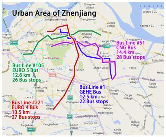 The research team collected the field data for four bus lines in Zhenjiang, China, and line features were displayed in Figure 1. As seen in Figure 1 and Table 1, these lines were similar in terms of traffic volume, number of lanes, degree of roads, length of lines, number of stops, and line features. Such selected routes consist of major transit corridors, which connect the relatively prosperous districts in the city. In addition, they also penetrate into dwelling districts, filling in the gaps of the backbone of urban bus. The data collection was conducted from 11 to 15 April 2016 under good weather conditions. The field data consisted of two parts: (1) bus vehicle characteristic data include fuel type, vehicle speed, and acceleration; and (2) emission situation data include bus pollutant emissions of carbon monoxide (CO), carbon dioxide (CO2), hydrocarbon (HC), and nitric oxides (NOX). Among them, bus pollutant emissions were measured by an AUTOplus automotive gas emission analyzer unit []. The AUTOplus automotive gas emission analyzer unit was employed to measure the second-by-second gaseous exhaust emissions from vehicle exhaust pipes including CO, HC, NOX, and CO2. Standard calibration gases were used to verify the accuracy of the system before each individual test, and to set the target pollutants to zero. With the help of an automatic vehicle location system, we also collected bus speed and acceleration values every second.