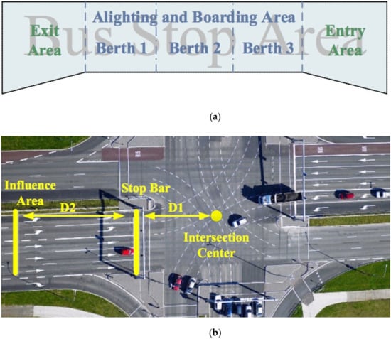 A bus stop influence area includes three sections: bus entry area, alighting and boarding areas for passengers, and exit area. In general, a stopped bus will slow from its running speed about 50 m before the bus stop, and accelerate back to its running speed about 30 m after the stop [,]. Thus, in this study, such a range of areas was regarded as the bus stop influence area, as shown in Figure 2a. An intersection influence area was divided into an inside area (D1) and intersection-related area (D2), as shown in Figure 2b. The existing research studies generally designated the road section ranging from a 150 ft (45 m) to a 250 ft (76 m) radius from the center of the intersection as the intersection influence area [,,,,].