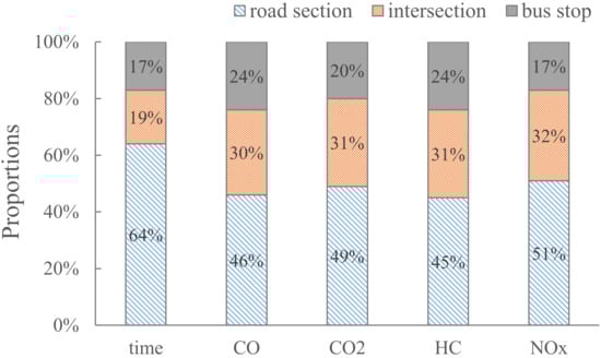 The bus emissions and time proportions at road sections, intersection, and bus stop influence areas are shown in Figure 3. The figure shows the total emissions of CO, CO2, HC, and NOX produced in and around bus stops, which accounted for 24%, 20%, 24%, and 17%, respectively, while intersections shared about 30% of all the emissions during the whole trip. Although the road sections accounted for higher proportions of emissions than other locations (with proportions of 46% for CO, 49% for CO2, 45% for HC, and 51% for NOX, respectively), the bus spent much more time on road sections. The findings showed that the emissions at bus stop and intersection influence areas led to a high exposure level of pollution in a short time.