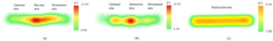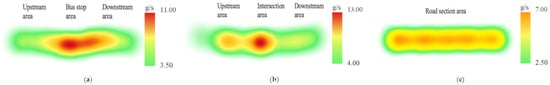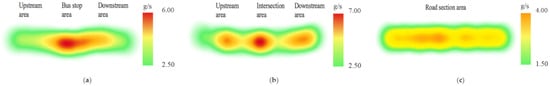 Heat maps for bus emissions of EURO-V. (a) Bus stop influence areas, (b) Intersection influence areas, (c) Road sections.