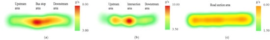 Heat maps for bus emissions of CNG. (a) Bus stop influence areas, (b) Intersection influence areas, (c) Road sections.