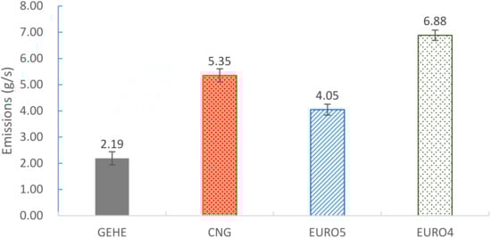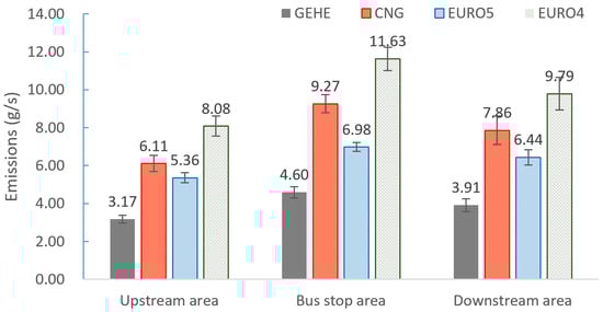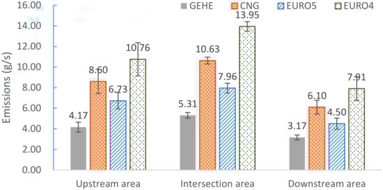 In order to better understand changes in bus emissions at the bus stop influence areas, intersection influence areas, and road sections, heat maps were introduced in this study using the measured data of total emissions including CO, CO2, HC, and NOX, as shown in Figure 4 (EURO-IV buses), Figure 5 (EURO-V buses), Figure 6 (CNG buses), and Figure 7 (GEHE buses). To generate a continuous surface from these collected discrete samples, Kriging interpolation was introduced to meet the rigorous demands of practical applications [,]. Choosing the appropriate variogram is the most important step in implementing Kriging interpolation. The spherical variation was applied here because it is the most widely used function of Kriging interpolation and it also basically meets the diffusion characteristics of gas. As shown in Figure 4, Figure 5, Figure 6 and Figure 7, different concentrations of pollutant emissions are depicted by different colors; the deeper the colors, the higher the pollutant emissions. From Figure 4a, Figure 5a, Figure 6a, Figure 7a, the results of the heat maps for bus stop influence areas showed that for different fuel types, the maximum emissions occurred at the bus stops and in the vicinity of them. This is because buses spend a long time conducting a complete stop and serving the alighting and boarding passengers. In addition, the downstream areas generated more emissions than the upstream areas for bus stop influences areas. This may be due to the fact that vehicle emission rates during the acceleration mode are comparatively higher than the deceleration mode. In the acceleration process, the engine needs more fuel to generate enough power to accelerate. The higher the acceleration rates, the more emissions are generated. In the upstream area, using regenerative breaking for the GEHE bus, the energy consumption and pollutant emission can be reduced, but cannot reach zero emissions. For intersection influence areas, as shown in Figure 4b, Figure 5b, Figure 6b, Figure 7b, the upstream areas generated more emissions than the downstream areas. This occurs because buses joining a queue must come to a stop and undergo several stop-and-go cycles until passing the intersection. As a result, emissions increase because of excessive delays and speed change cycles for approaching traffic. In contrast with bus stop and intersection influence areas, there was no obvious difference in emissions at different locations for road sections, as shown in Figure 4c, Figure 5c, Figure 6c, Figure 7c. Figure 8, Figure 9 and Figure 10 compared the average values and standard deviations of emissions for different fuel type buses in each location. It can be seen from the figure that the emission results at different locations were similar. EURO4 buses exhausted more than other types of buses, which indicated that the emissions of EURO5 buses were greatly improved compared to EURO4 buses in all driving conditions. CNG buses emitted slightly more than EURO4 vehicles. The emissions of GEHE vehicles were significantly smaller than other models, only about half of those of EURO4 and CNG buses, and its emissions fluctuated less than other models.