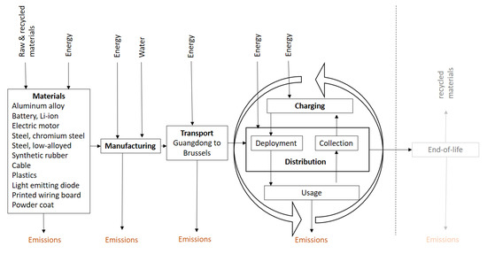 The concept of product-service systems (PSS) has its origin in the late 1980s [17] but was already mentioned before under different terminologies, such as servitization [18]. PSS was used as such in a report in 1999 by Goedkoop et al. [19]. Since then it has been widely spread in the scientific literature [20]. The concept of PSS refers to “a system of products, services, supporting networks and infrastructure that is designed to be: competitive, satisfy customer needs and have a lower environmental impact than traditional business models” [21]. The PSS business models are considered by some authors as business models that could support the creation of sustainability and are potentially able to lower the environmental impacts in comparison to a traditional business model [18,22,23,24]. In that perspective, the concept of PSS is not specific to one type of sector but, rather, belongs to the category of sustainable and circular business models [25]. As such, it can be considered as a smaller loop inside the circular economy model, focusing on the intensification of the product use or its dematerialization. In 2004, Tukker [26] proposed a three category classification for the PSS which has been widely accepted since. Product-oriented, in which a product is sold with a service attached to it, use-oriented, in which the use of a product is sold but the product ownership remains to the provider and, finally, result-oriented, in which the provider sells a result and decides about the way to reach that result. The dockless e-scooter belongs to the second category, the use-oriented PSS and more precisely to the sub-category product renting or sharing. This sub-category is defined as follows: “the product in general is owned by a provider, who is also responsible for maintenance, repair and control. The user pays for the use of the product. […] The same product is sequentially used by different users” [26]. In the mobility sector, many examples of use-oriented PSS exist, but two examples of mobility offers are often put forward and make the linkage between use-oriented PSS and mobility: car and bike sharing. The environmental or sustainability performance of those PSS in the mobility sector has been assessed in many case studies [27,28,29,30,31]. All of them find better results for the PSS than its equivalent in the linear system. The term ‘linear system’ is used in opposition to the circular system and describes a system in which a product is being produced, sold, used, and then sent to end-of-life treatment (take-make-waste). Finally, the LCA of a shared bicycle system [32] showed that the modes of transportation replaced by the use of the shared bicycles have more impacts than the bicycles. Hence, the authors conclude that, as such, the shared bicycle is an environmentally friendly solution able to lower pollution.