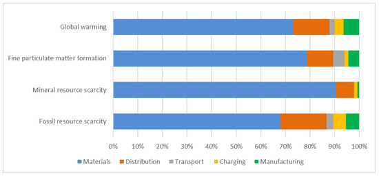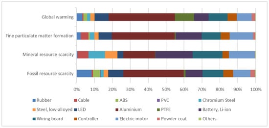 The results show a GWP of 131 g CO2-eq.*p∙km−1. With a contribution between 68% and 90% of the total impacts, the materials phase is by far the most impacting phase for the four analyzed impact categories. As indicated in Figure 3, the impacts of the material phase are mainly driven by the aluminum which constitutes almost half of the e-scooter weight. In addition to the high mass share, the aluminum production has a high impact intensity, for example regarding the energy consumption necessary to separate the metal from the oxide. The Li-ion battery, the wiring boards, and the electric motor are the following impacting elements of the e-scooter. The global warming score of the polytetrafluoroethylene (PTFE) is due to the presence of fluorine and the emission of fluorinated compounds. Numerical data for Figure 3 and the following figures are given in the Supplementary Materials.
