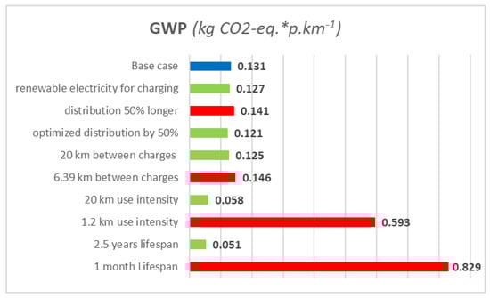 The sensitivity analysis indicates that results are more sensitive towards changes in the use intensity or in the lifespan than other changes in the distribution, electricity or the distance travelled between two charges. This analysis also shows that the providers that launched basic e-scooters and then stopped their offer after only a month must have had a comparatively high impact, of around 0.8 kg of CO2-eq.*p∙km−1 which is over the use of a car.