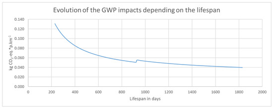 Compared to the base case results (of 131 g of CO2-eq.*p∙km−1), the expansion of the lifespan of only 4.5 months leads to a reduction of the GWP to 91 g of CO2-eq.*p∙km−1. As the lifespan increases, the impacts decrease but slower in proportion. Hence, in a hypothetical 5 year lifespan scenario, the GWP would be equal to 40 g of CO2-eq.*p∙km−1, which gets close to the use of an electric bicycle (26 g of CO2-eq.*p∙km−1) from the Ecoinvent data. Figure 6 shows the variation of the impacts in terms of greenhouse gas emissions depending on the lifespan of the e-scooter. Maintenance and part replacement is modeled at 2.5 years (913 days) lifespan explaining the increased impact at this point.