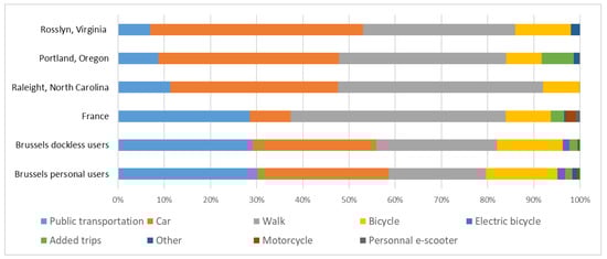 Comparative data on the modal share can be found for others cities. A statistical study [43] on a sample of more than 4000 dockless e-scooter users was carried out in France. Users were asked about their last e-scooter trip and answered which other mode of transportation they would have used in absence of the e-scooter. Unlike the Brussels Mobility study, in which several answers could be selected, only one answer could be given. The modal share is also calculated in Hollingsworth et al. study [16], but their sample consists of only 61 e-scooter users and the question is formulated differently: “If e-scooters were not available, what percentage of the time would you use these alternatives?” [41]. Another modal share is calculated based on a small sample of 56 users in [15] from the city of Rosslyn, Virginia, USA. Finally, a survey [44] on 3444 Portlander e-scooter users was conducted where the user was asked to determine one alternative transportation mode. All those modal shares are summarized in Figure 8.