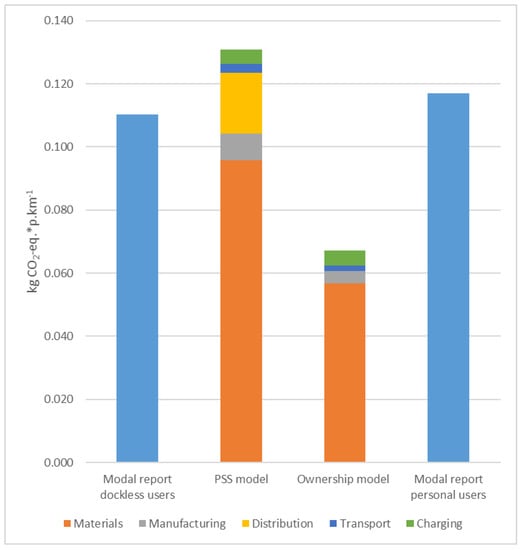 The GWP of the use of the personal e-scooters is equal to 67 g of CO2-eq*p∙km−1. Figure 9 shows that while the dockless e-scooter emits 21 g of CO2-eq. more than the modal share, the personal e-scooters emit 50 g of CO2-eq. less than what they replace. Therefore, in the case of the e-scooter, the PSS model is more impacting than the ownership model for two main reasons. In the first place, the lifespan of the personal e-scooter is longer due to better usage and the reduction of vandalism or misuse. Secondly, no collection and deployment by van is needed. The electricity for charging remains the same. Figure 9 also emphasizes that the GWP of the mode of transportation displaced by the users of personal e-scooter is 6% higher than those of the dockless e-scooter users. This makes the use of the personal e-scooter a more sustainable option than the use of dockless e-scooter, even if the impacts of their usage were the same.