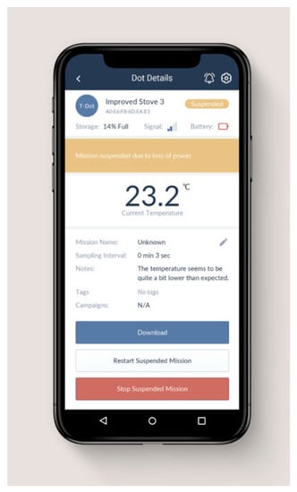 When a user connects to a Dot via Bluetooth, the user can download the Dot’s sensor data. These data transfers take from a few seconds to a few minutes depending on the amount of data in the Dot’s memory. The application then displays the downloaded data on an interactive chart. This differs from many traditional data loggers, where data might need to be downloaded to a laptop, then loaded into an application (such as Microsoft Excel) to generate charts—all before data quality can be evaluated. The interactive chart on the mobile application can be immediately used for in-field quality control checks of sensor placement (e.g., for a cooking fire, to ensure that temperature spikes are hot enough to clearly detect cooking on a stove but not so hot that they damage the sensor), participant behavior and/or compliance (e.g., confirmation that a participant is using an intervention cookstove), or to validate and elaborate participants’ survey responses (e.g., a user reported cooking three times yesterday, but the sensor data shows just one single meal—why might this be?).