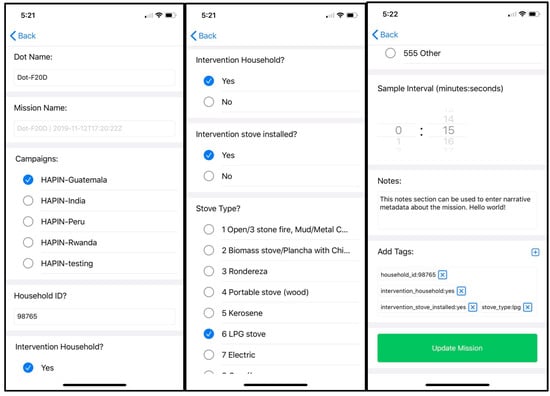 When installing Dots, HAPIN field staff answer a common set of questions about each deployment on handheld tablets using the inbuilt survey (Figure 4). These include data on the specific stove type on which the Dot is installed, the household ID, the type of household (intervention or non-intervention), and other metadata that can subsequently be used to filter and subset data. For example, trial investigators can examine data by country, by intervention status, and/or by stove type.