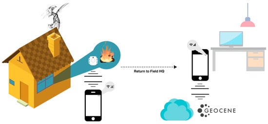 Schematic of Geocene data collection. Fieldworkers either visit households or, in some cases, walk near households. Dots within range are found by the mobile application and data can be downloaded and the Dot relaunched. When fieldworkers return to their field HQ, where they have Wi-Fi and/or cell service, data is transmitted to Geocene’s cloud servers for warehousing and processing.