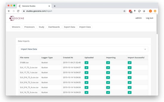Raw sensor data that is synced via the mobile app is first written to Amazon S3. Then, a series of server-based workers import queued raw data into a relational database. Raw logger data from non-Geocene data loggers can also be imported into the platform from a web dashboard (Figure 6).