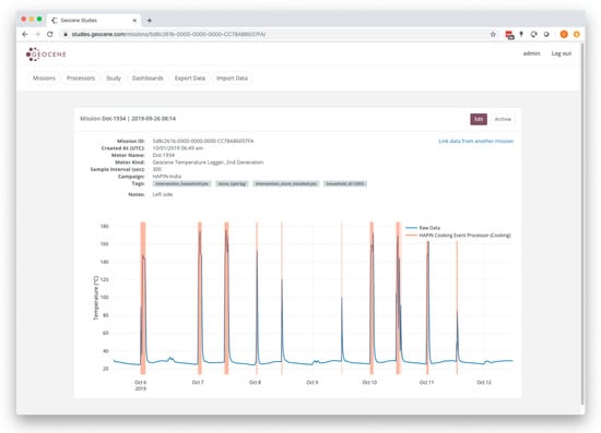Details of a mission in the Geocene dashboard. Data visualized in the screenshot above includes the raw temperature trace (the continuous blue line) and areas identified as a stove use event (the highlighted orange bars). The plot on this dashboard is zoomable and scrollable, allowing users to focus on areas of interest.