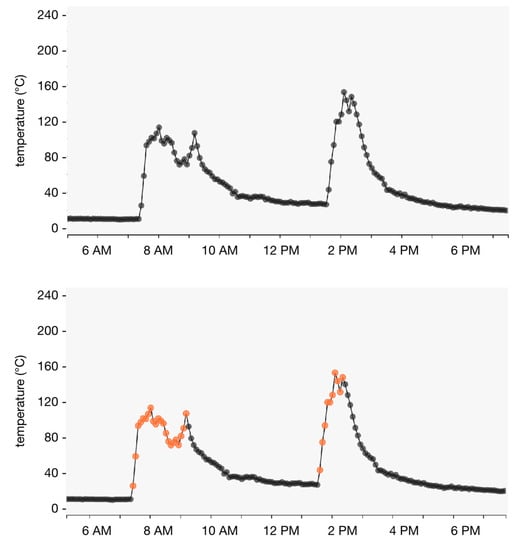 Sample data from a Geocene Dot temperature logger. The top panel includes data prior to analysis with FireFinder; the bottom panel shows the periods FireFinder identified as cooking (in orange).