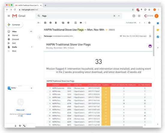 To help improve data quality and increase accountability, HAPIN uses custom dashboards and email alerts through the Geocene platform. Site leaders receive weekly email alerts with screenshots of dashboards listing households with traditional stove use (Figure 10), Dots with technical problems, and missions with missing or corrupt metadata.