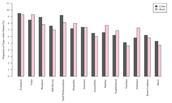 The chi-square goodness of fit tests reveal that topics are not equally distributed in reviews of urban locations (χ2 = 3339.40, p-value < 0.001) and rural locations (χ2 = 591.92, p-value < 0.001), thereby showing a difference in the importance of topics among customers staying in both urban and rural locations. Wilcoxon Signed Rank tests demonstrate that the distribution of the prominence of topics between urban versus rural locations are not the same (p-value < 0.001). Specifically, the most prominent topics for urban accommodations are evaluation, staff professionalism, and reception. Whereas, rural accommodations observe the highest proportion of reviews regarding both value and evaluation, followed by staff professionalism and hospitality. Comparisons between urban and rural accommodations via the proportions for each topic are visualized in Figure 1.
