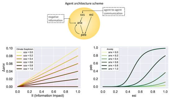 For each agent, a set of internal attitudes related to climate change messaging are implemented. The agent architecture (see Table 1), i.e., the parameters describing the internal states and properties of each agent, is comprised of an anxiety state (), internal orientations of both climate change scepticism () and environmental self-identity (), and an intention to pro-environmental behaviour () that reflects the behavioural layer in correlation to the three other internal attitudes. A simple scheme of the correlations of the four agent parameter is provided in Figure 1 (top) and the mathematical representations are given in Figure 1 (left, right). When an agent receives information, an anxiety reaction is triggered, the response function is shown in Figure 1 (left). The amount of anxiety increase depends on the value of an individual’s (colour code) and the information impact (x-axis), i.e., how severe or negative the information is. Without detailed knowledge of the correlation of stimuli and reactions, we assume linearity, i.e., that a stimulus of twice the impact leads to twice the anxiety. This linear response is added to the anxiety state of the individual, which increases most for low and high information impact. If no information is received, the anxiety state follows a small natural rate of decay.