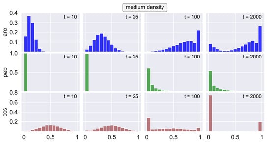 Temporal evolution of heterogeneous behaviour: Evolution stages of (green), (blue) and (brown) shown in four chronological time steps (from left to right). The balanced population of initial distributions around is exposed to a medium information density, representing the moderate case of development patterns. Parameter = 10,000.