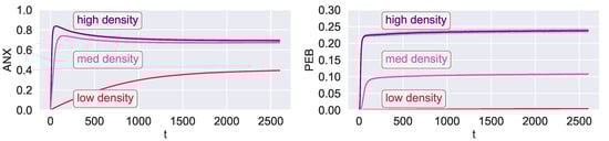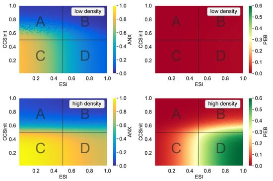 The initial configuration of the population, i.e., whether it is a population with low or high environmental values or climate scepticism (four quadrants), is decisive for the outcome of the behaviour patterns. To test the dependence of the environmental intention (PEB probability) on the internal parameters ( and ) of the agents, we perform a complete parameter variation, as shown in Figure 4. Here the initial distributions of both parameters are varied with and , reflecting the four population quadrants A, B, C and D. The results are given for the mean collective anxiety (left column, Figure 4) and the mean collective PEB probability (right column, Figure 4). The initial mean parameters are reflected by the -axis. Results are displayed for the mean of 10 (high density) and 5 (low density) simulation runs for each set of parameters.
