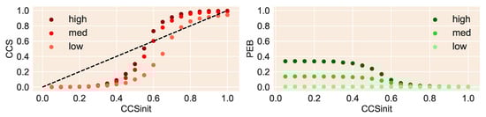 Dependence on initial climate change scepticism: Correlation of initial and resulting (left) climate change scepticism and (right) pro-environmental behaviour . Results shown for three different information densities (low, medium, high) as shown in the legend. Parameter: .