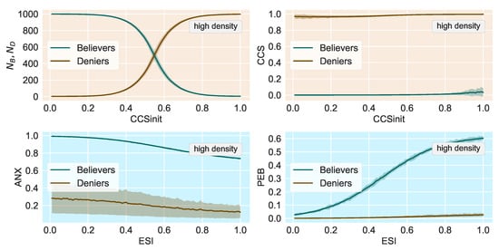 Figure 2 shows this dynamical processes for a balanced population under exposure of medium information density: First, an increase in anxiety is visible while the PEB probability and collective distribution are steady. With a delay, the scepticism divides and the normal distribution with mean is dispersed. Strong believers () and strong deniers () become more frequent while the rest of the opinion range is uniformly present. While this process continues, the intention for pro-environmental behaviour is not affected. At , an equilibrium state is reached and shows a pronounced heterogeneity especially for the anxiety levels and scepticism of climate change. The population is separated into two strongly opinionated groups of unequal group sizes. The overall high anxiety is due to the larger group of strong believers. However, the environmental intention is significantly lower than the correlated anxiety level and this example results only in a small impact of negative climate information by medium density.