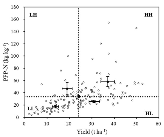 The study adopted a farmer grouping method by yield and partial factor productivity of N fertilizer (PFP-N) [28] to analyze the relationship between various environmental impacts and related management practices among farmers. Based on average yield and PFP-N (Figure 2), the survey data of 155 farmers were divided into the following four groups: HH (high yield and high PFP-N), HL (high yield and low PFP-N), LH (low yield and high PFP-N), LL (low yield and low PFP-N) (Figure 1). The numbers of farmers in the LL, LH, HL, and HH groups were 62, 17, 30 and 46, respectively. The partial factor productivity of N fertilizer (PFP-N) (yield (kg ha−1) divided by N application rate (kg ha−1)) means the amount of N fertilizer applied when producing unit yield, which is a significant index of N fertilizer efficiency in crop production [32,33].