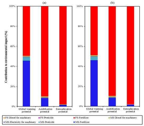 Contribution of individual input to the environmental impact (indicated by global warming, acidification, and eutrophication potential) in Danling County, Sichuan, southwest China based on returned survey questionnaires from 155 farmers when expressed as per hectare of citrus planted area (a) or per ton of citrus production (b). MS and FS represented the agricultural materials production stage and arable farming stage, respectively.