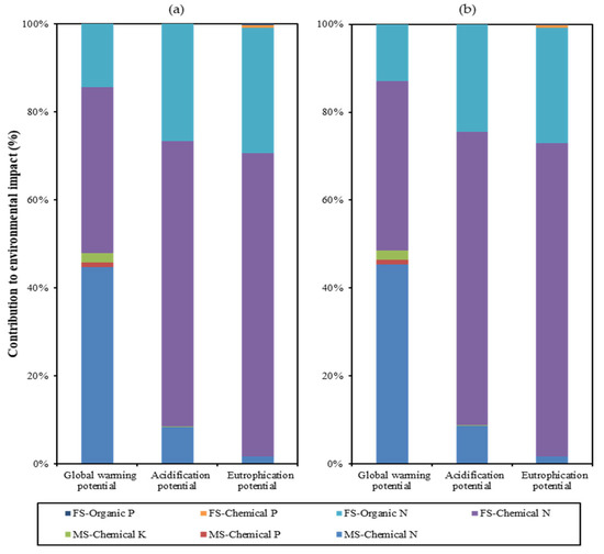 Contribution of fertilizers input to the environmental impact (indicated by global warming, acidification, and eutrophication potential) in Danling County, Sichuan, southwest China based on returned survey questionnaires from 155 farmers when expressed as per hectare of citrus planted area (a) or per ton of citrus production (b). MS and FS represented the agricultural materials production stage and arable farming stage, respectively.