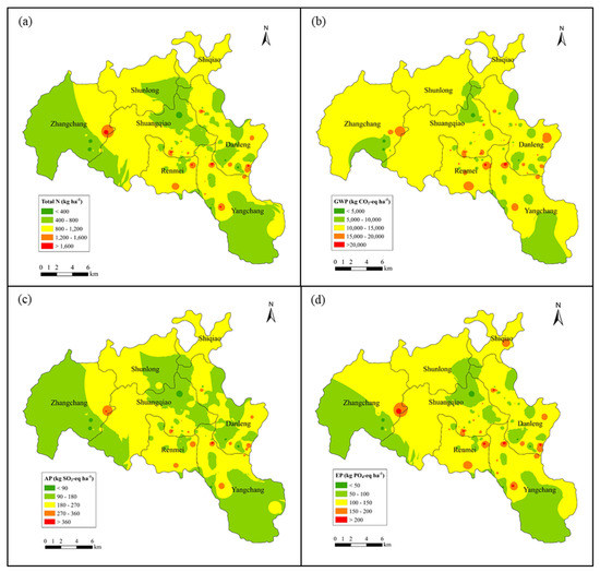 Geographical distribution of total nitrogen fertilizer input (a), global warming potential (b), acidification potential (c), and eutrophication potential (d) when expressed as per ton of citrus production in Danling County, Sichuan, southwest China based on returned survey questionnaires from 155 farmers in 2017 and 2018.