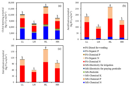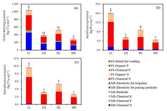 Global warming potential (a), acidification potential (b), and eutrophication potential (c) per hectare of citrus production in four groups of investigated farmers in Danling County, Sichuan, southwest China. The four groups included: HH (high yield and high PFP-N), LH (low yield and high PFP-N), HL (high yield and low PFP-N), and LL (low yield and low PFP-N) groups, respectively. MS and FS represented the agricultural materials production stage and arable farming stage, respectively. The bars were means + standard error; The column with different letters indicated significant difference at p < 0.05.