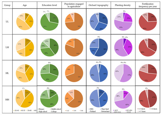 Less application of N fertilizer, especially chemical N fertilizer resulted in lower environmental costs in HH group (Figure 6 and Figure 7). Such management was related with among HH group orchards and other orchards (Figure 8). In term of farmer age, the proportion of farmers less than 50 years old was 58% in HH group, which was higher than that in other groups. For education level, 84% of family major labor in HH group received junior high school and above education, which was better than other groups. In addition, more than 64% of orchards are managed by less than two labors. For orchard conditions, high yield orchards were planted in sloping and/or flat fields with proper planting density (625–1112 plant ha−1). Furthermore, the proportion of citrus orchards fertilized less than four times was 47% in HH group, which was obviously higher than other groups (Figure 7).