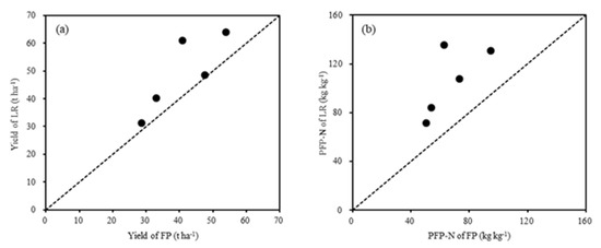 The correlation of yield (a) and PFP-N (b) between the local recommendation (LR) treatment and farmer practice (FP) treatment in five field experiments in Danling County, Sichuan, southwest China. The PFP-N was an index of nitrogen (N) use efficiency in crop production, which was calculated as yield (kg ha−1) divided by N application rate (kg ha−1).
