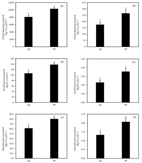 The means of global warming potential (a, d), eutrophication potential (b, e), and acidification potential (c, f) in five field experiments when expressed as per hectare of citrus production (a–c) or per ton of the citrus production (d–f). LR and FP represented treatments of local recommendation and farmer practice, respectively. The bar indicated mean + standard error; The columns with different letters indicated significant difference at p < 0.05.